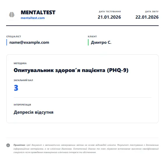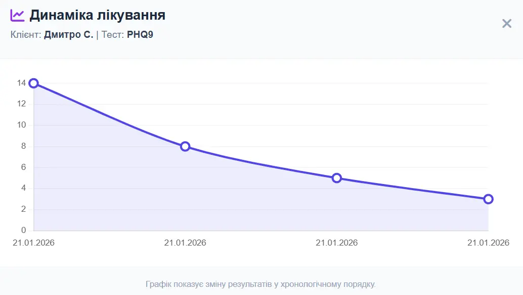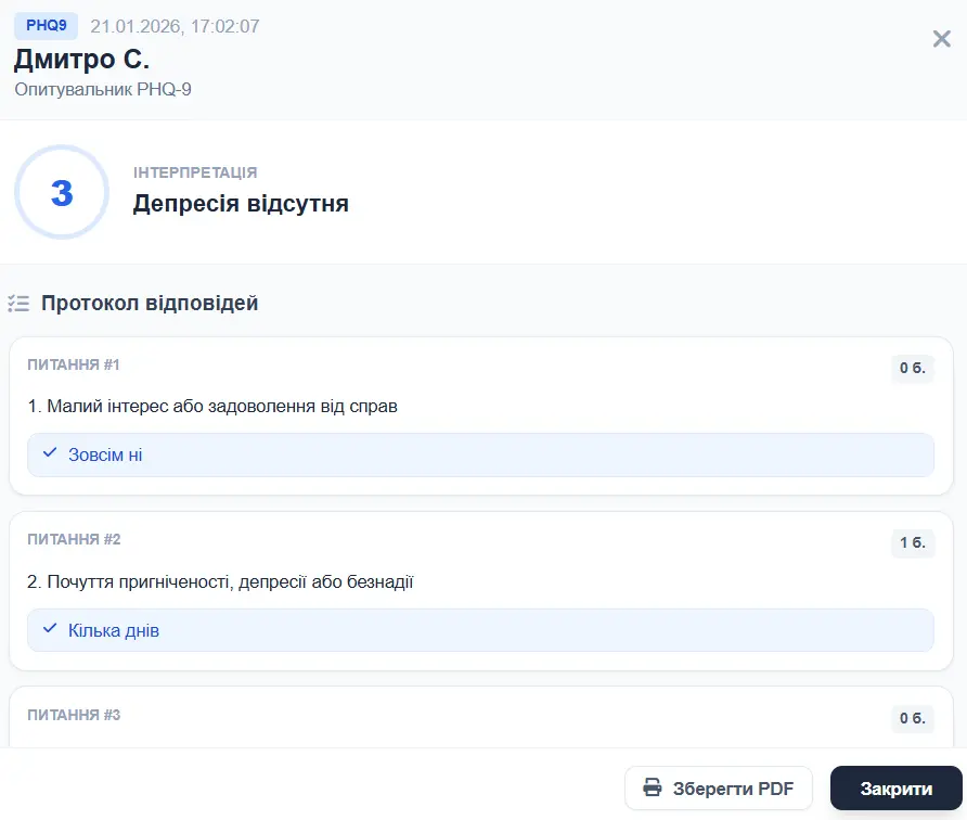 Сервіс для психологів, психотерапевтів, психіатрів та фахівців сфери ментального здоров'я, який автоматично підраховує результати тестів і надає коротку професійну інтерпретацію.